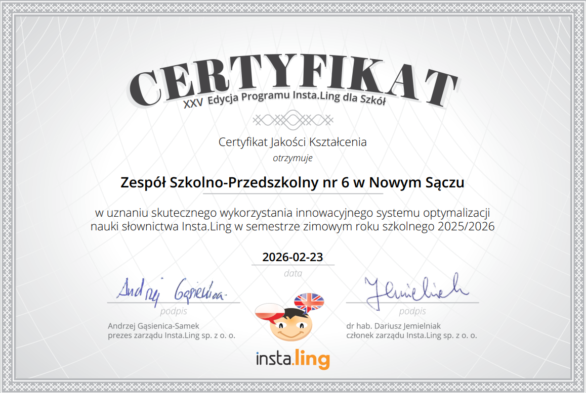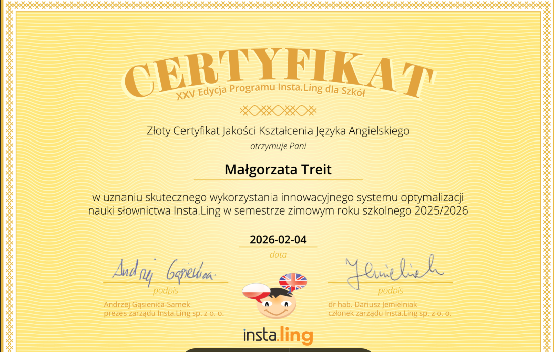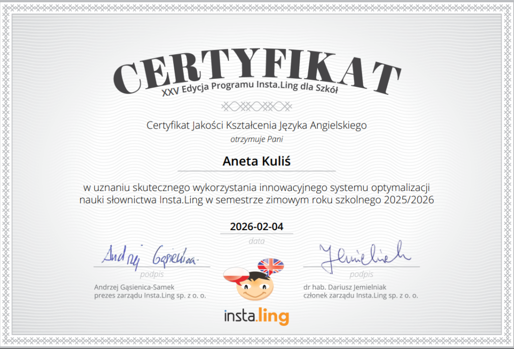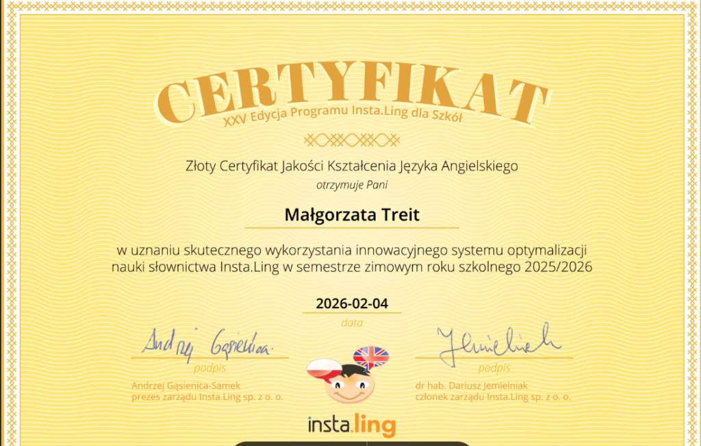 Za nami pierwszy semestr efektywnej pracy z platformą Instaling, która promuje naukę języków obcych wśród uczniów, rozwija umiejętności korzystania z różnych źródeł i narzędzi TIK , uatrakcyjnia proces nauczania i uczenia się oraz podnosi jakość pracy szkoły, ucznia i nauczyciela. W naszej szkole Instaling wspiera naukę języka angielskiego. W XXV edycji programu uczniowie klasy 5a pod opieką pani Małgorzaty Treit oraz klasy 6b pod opieką pani Anety Kuliś dzięki systematycznej pracy mieli szansę doskonalić swoje umiejętności językowe, a ich wysiłek nagrodzony został dyplomami oraz certyfikatami.